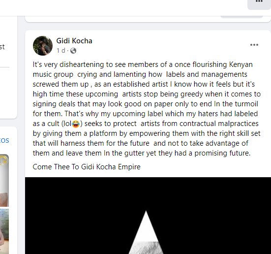 Gidi Kocha is the latest artist to air his opinion after a member of a once famous Gengetone group went public with the details of how both the groups management and a renown city label used and left them dry.